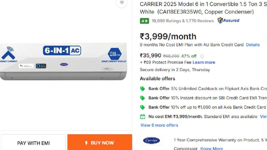 The Carrier 6 in 1 is another top alternative that you can opt for if you seek a comprehensive cooling solution for your home. The Air Conditioner has been given a Pm 2.5 HD Filter for improved Air Quality. Beyond that the Air Conditioner has been tested at 52 degree Celsius for a more optimized performance while emitting cooling. The AC can offer the users a comprehensive solution for cooling as beyond the other factors the air conditioner is also able to operate as low as 0.8KW electricity for the ultimate energy saving. The Air Conditioner is available in a slew of variants with variable star rating and tonnage the 2 ton variant is right now available on Flipkart for Rs 57,990.