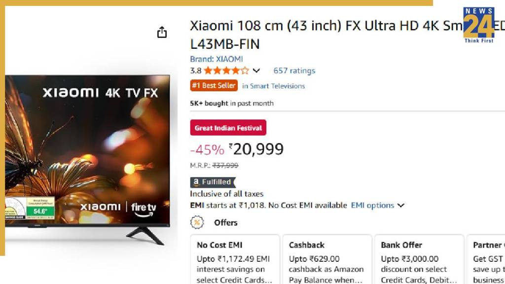 The 43-inch Xiaomi TV features a 4K LED display and smart connectivity options like Miracast and Apple AirPlay. It also includes built-in Alexa.