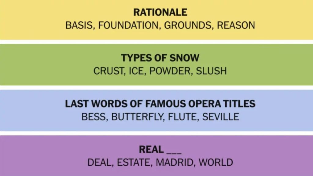 Each group is colour-coded with the yellow group being usually the easiest to guess, blue and green are in the middle, and the purple group is usually the hardest. The purple group usually contains wordplay.