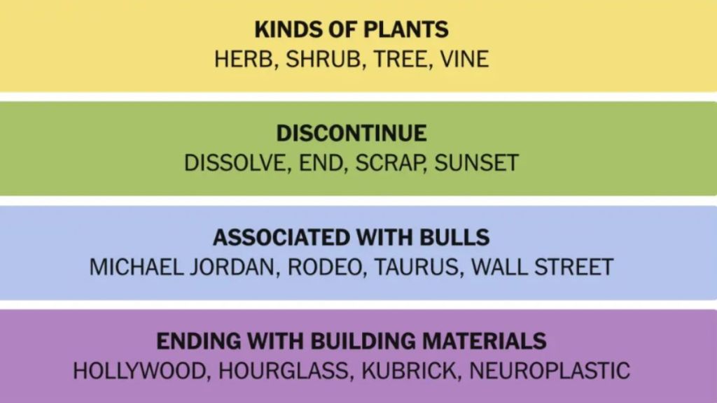 Since there is only one solution to each puzzle, you need to be wary of words that might fit into more than one category. You can mix up words to potentially see the connections between them.