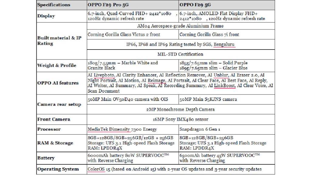 The F29 pro has een equipped with a Mediatek Dimesity 7300 Energy Chipset; the chipset has been optimized for power efficiency and gaming . The F29 has been powered by a a snapdragon G Gen 1 on which you can easily play games at 60FPS + frame rate 50 MP Main, 2MP Depth and 16MP Selfie cameras on the OPPO F29 Pro and the OPPO F29.