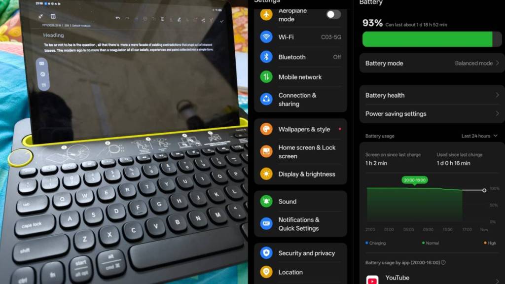 The 9,340 mAh battery is impressive. Our usual usage included reading PDFs, watching YouTube, proofreading, video calls, and streaming, and throughout all that the tablet was able to last a whole day with ease. The 33W charging support means the tablet can get fully charged within 1.5 hours. Oppo’s smart power-saving mode works well and minimises battery drain effectively.