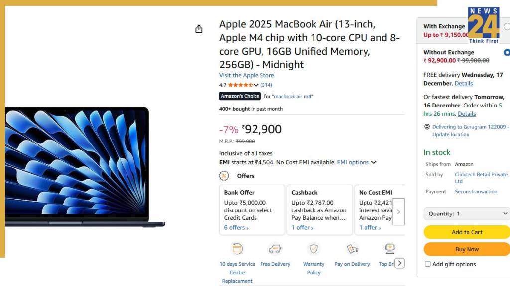 Against the launch price of Rs 99,000, the 13-inch MacBook Air with 16GB RAM and 256GB storage on Amazon is now available for Rs 90,900. The MacBook is now available at a discount of around Rs 10,000; the price cut is quite significant, and might be the lowest price that the M4 MacBook has ever retailed for.