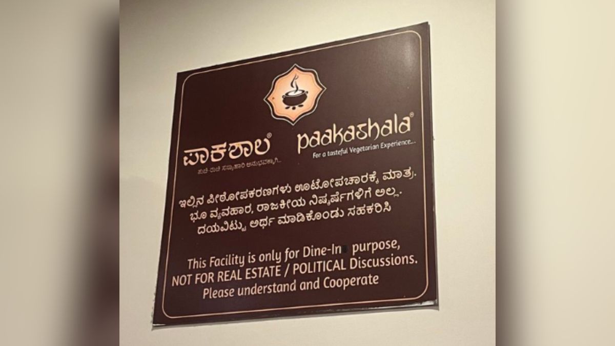 The Paakashala sign says: “This place is for eating only, not for real estate or political talks. Please understand and cooperate.”This facility is only for dine-in purpose, not for real estate/political discussions. Please understand and cooperate.”