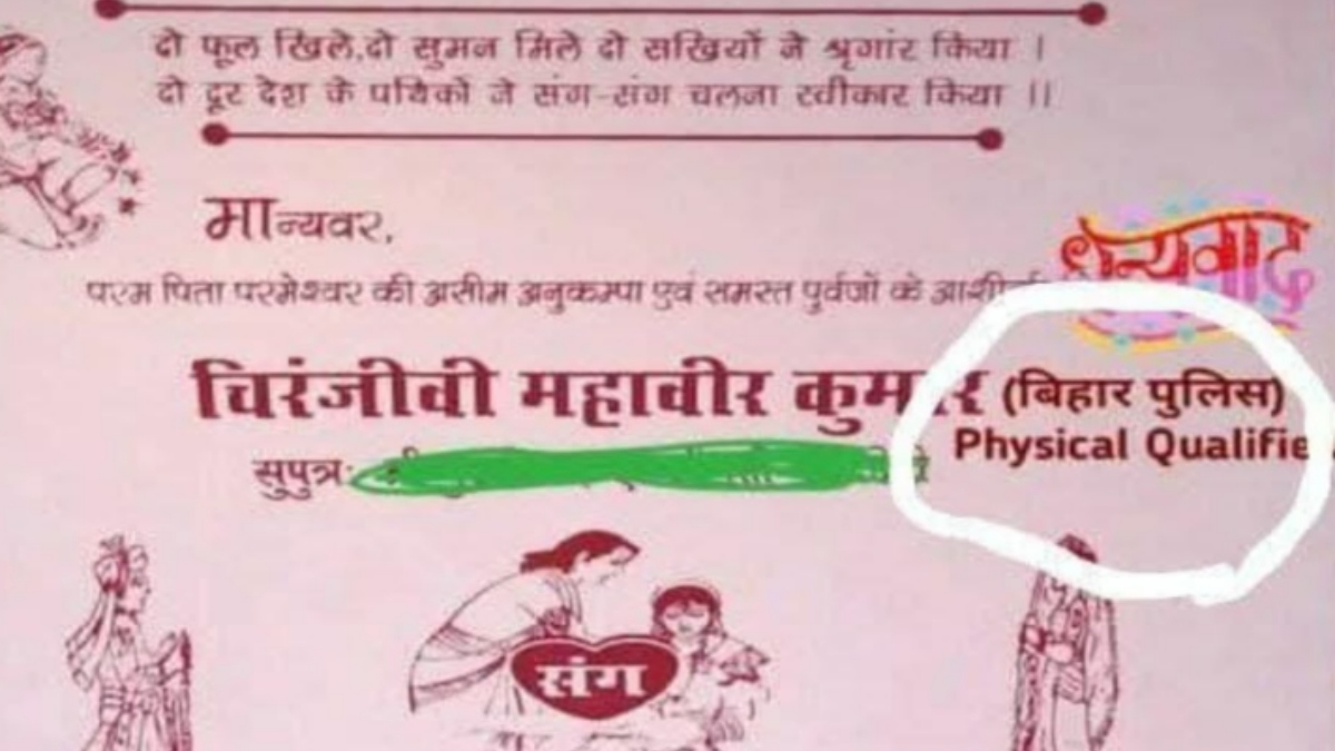 A wedding invitation card from Bihar has gone viral on social media, and it all comes down to one unexpected line. While most wedding invitations have the basic details (like the name of the couple getting married and the wedding date), this groom included a badge of honor next to his name: “Bihar Police Physical Qualified.”