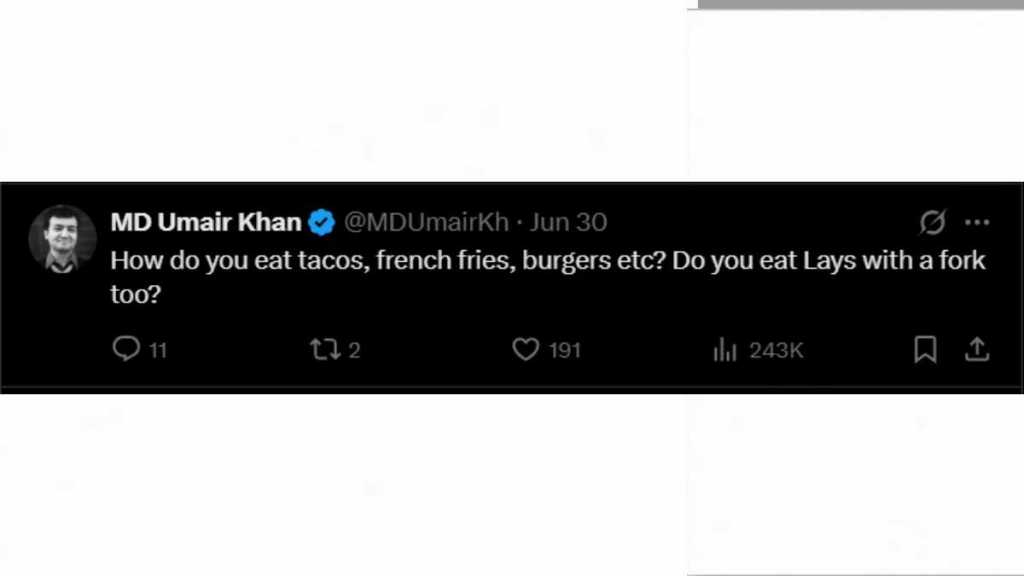 A user asked, “How do you eat tacos, French fries, burgers, etc? Do you eat Lays with a fork, too?”