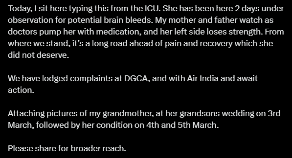“We have lodged complaints at DGCA, and with Air India and await action,” Parul said, adding, “Attaching pictures of my grandmother, at her grandson’s wedding on 3rd March, followed by her condition on 4th and 5th March.”