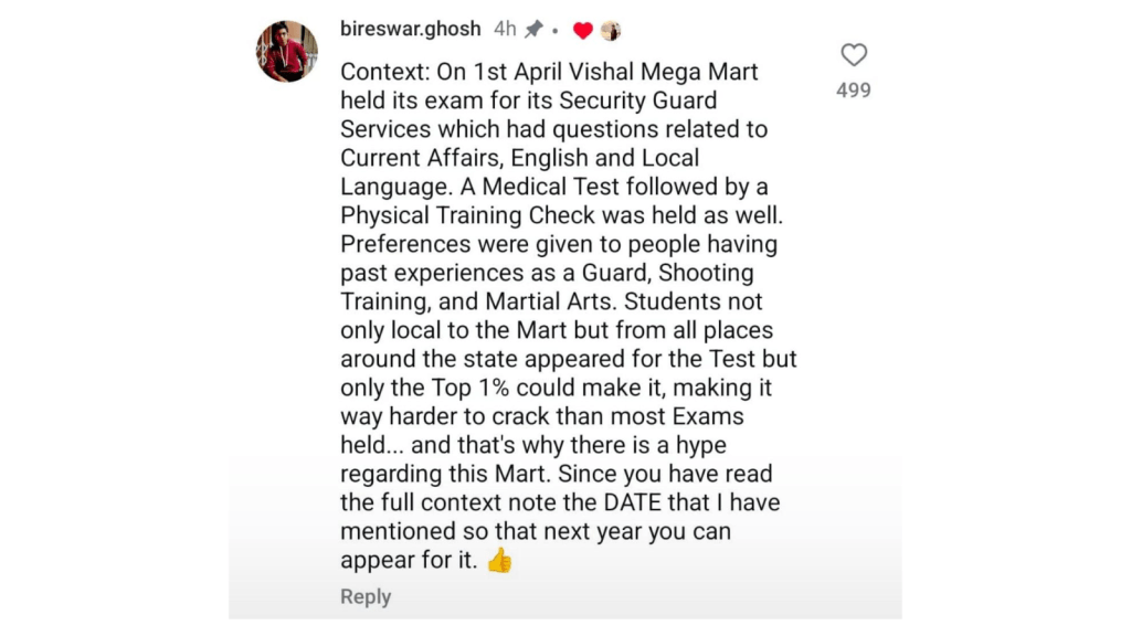 According to an Instagram user, “On 1st April, Vishal Mega Mart held its exam for its Security Guard Services, which had questions related to Current Affairs, English and Local Language. A Medical Test followed by a Physical Training Check was held as well. Preferences were given to people having past experiences as a Guard, Shooting Training, and Martial Arts. Students not only local to the Mart but from all places around the state appeared for the Test, but only the Top 1% could make it, making it way harder to crack than most Exams held.”