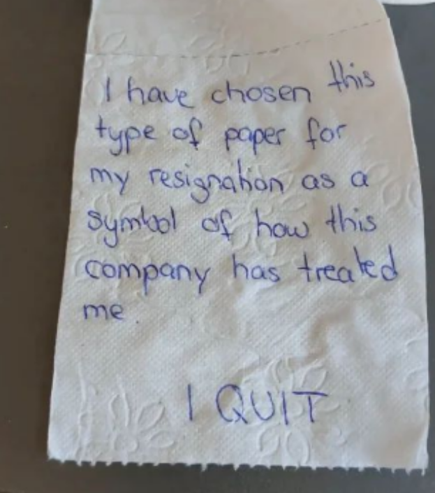 She reflected on the deeper issue at hand, adding, “Appreciation isn’t just a tool for retention. It’s a reflection of how much a person is valued, not just for what they do but for who they are.” She concluded her post by stating that if people leave feeling undervalued, then it’s time to reflect: “Small changes in appreciation have a big impact. Start today.” Meanwhile, Angela attached a picture of a resignation note written on a piece of toilet paper. It read, “I have chosen this type of paper for my resignation as a symbol of how this company has treated me. IQUIT.”