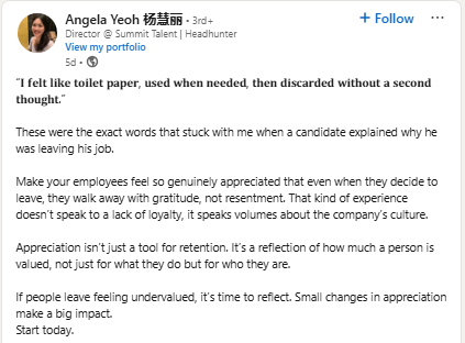 She recalled the striking words, noting, “These are the exact words that stuck with me when a candidate explained why he was leaving his job.” The note has probably left a lasting impression on her, thereby highlighting why workplace culture matters. She wrote, “Make your employees feel so genuinely appreciated that even when they decide to leave, they walk away with gratitude, not resentment. That kind of experience doesn’t speak to a lack of loyalty, it speaks volumes about the company’s culture.”