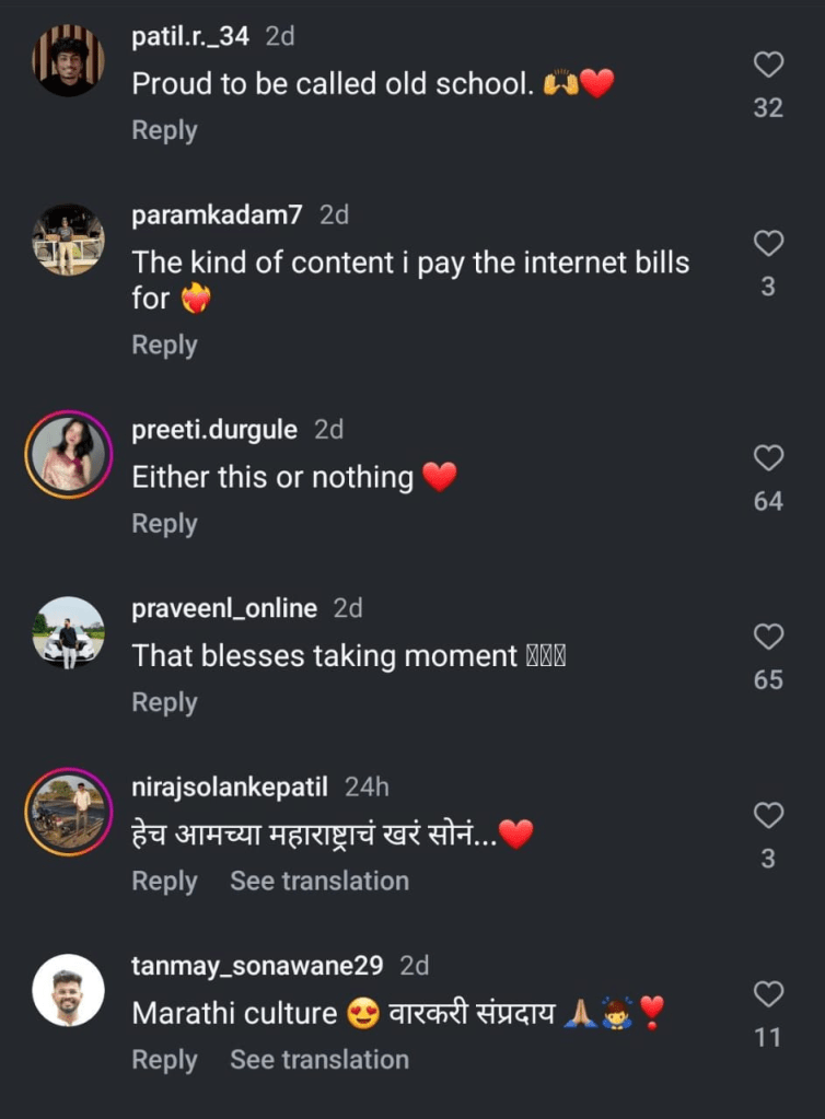 A user commented, “Maharashtrian Dada Dadi”, while another user wrote, “If true love had a face.” A third user said, “Ending was more beautiful the way she gave respect to him.” A fourth user remarked, “The respect with which she touched his feet.. This generation needs to learn a lot about what love and respect is…How much love and respect this man would have given his love that she can bow down to him with pure emotions anywhere and not for making reels just showing fake love or respect.”