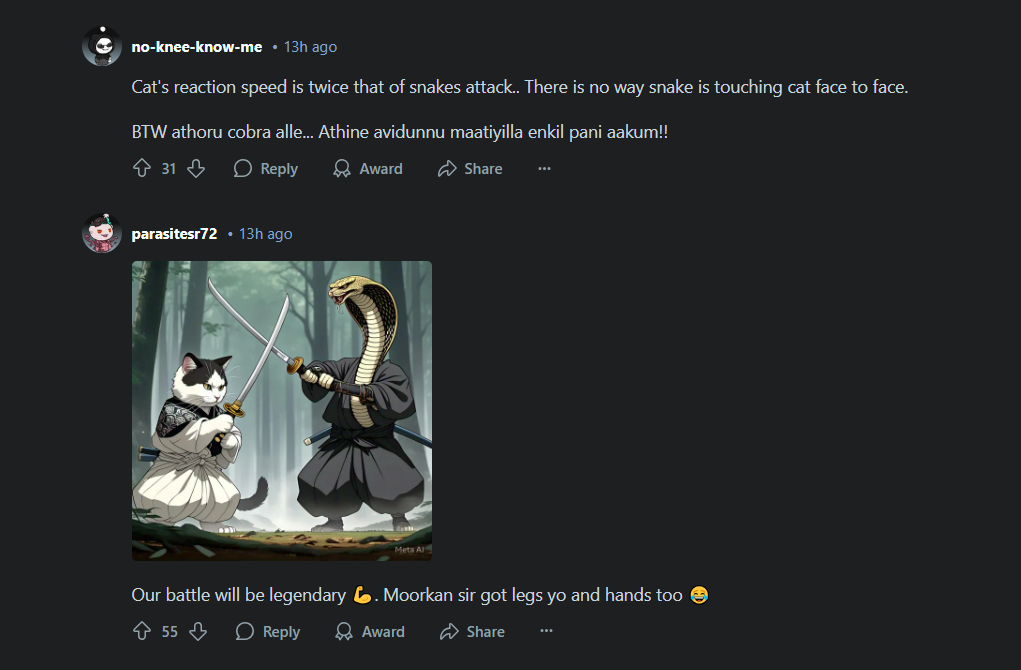 A user wrote, “We all know how that’s gonna go.” Another noted, “Cat-astrophic experience for the snake there!” A third user commented, “I feel bad for the snake. Cats have an insane reaction speed, and snakes can’t compete with that,” while a fourth user asked, “Who won?”