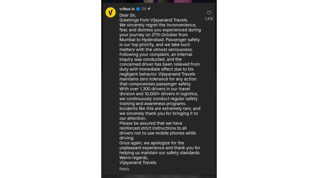The statement read, “We sincerely regret the inconvenience, fear, and distress you experienced during your journey on 27th October from Mumbai to Hyderabad. Passenger safety is our top priority, and we take such matters with the utmost seriousness. Following your complaint, an internal inquiry was conducted, and the concerned driver has been relieved from duty with immediate effect due to his negligent behavior. Vijayanand Travels maintains zero tolerance for any action that compromises passenger safety. With over 1,300 drivers in our travel division and 10,000+ drivers in logistics, we continuously conduct regular safety training and awareness programs. Incidents like this are extremely rare, and we sincerely thank you for bringing it to our attention. Please be assured that we have reinforced strict instructions to all drivers not to use mobile phones while driving. Once again, we apologize for the unpleasant experience and thank you for helping us maintain our safety standards.”