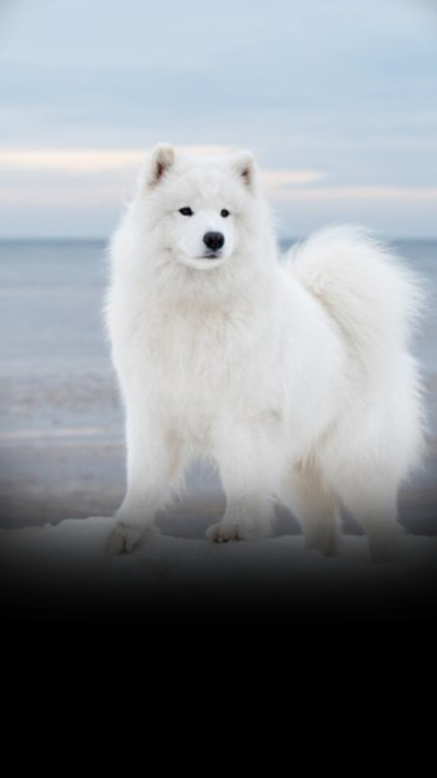 Samoyed Known for their friendly smile and thick white coat, Samoyeds are playful, affectionate, and loyal companions.