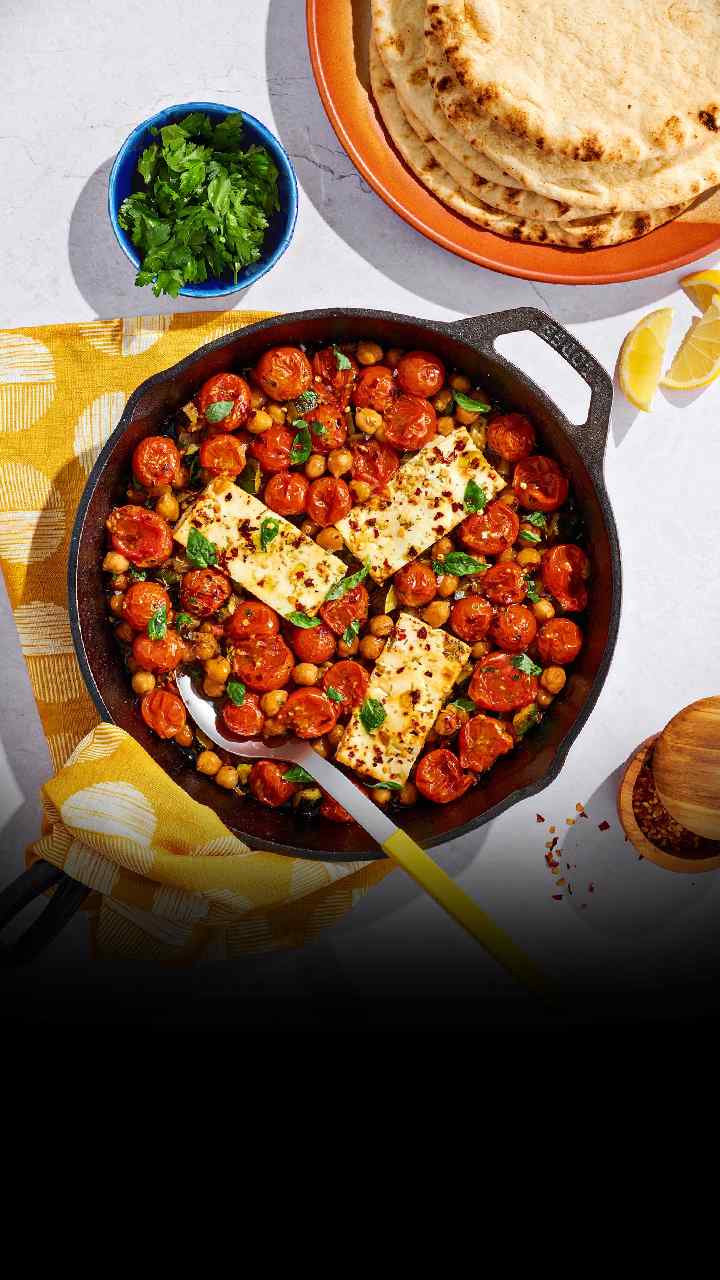 Preheat oven to 400°F (200°C). In a baking dish, mix chickpeas, cherry tomatoes, garlic, and olive oil.