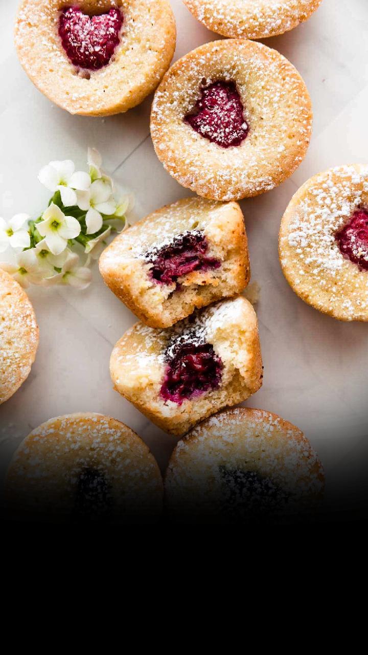 Egg whites, butter, flour, almond flour, sugar, berries, baking powder, lemon zest, vanilla, salt.
