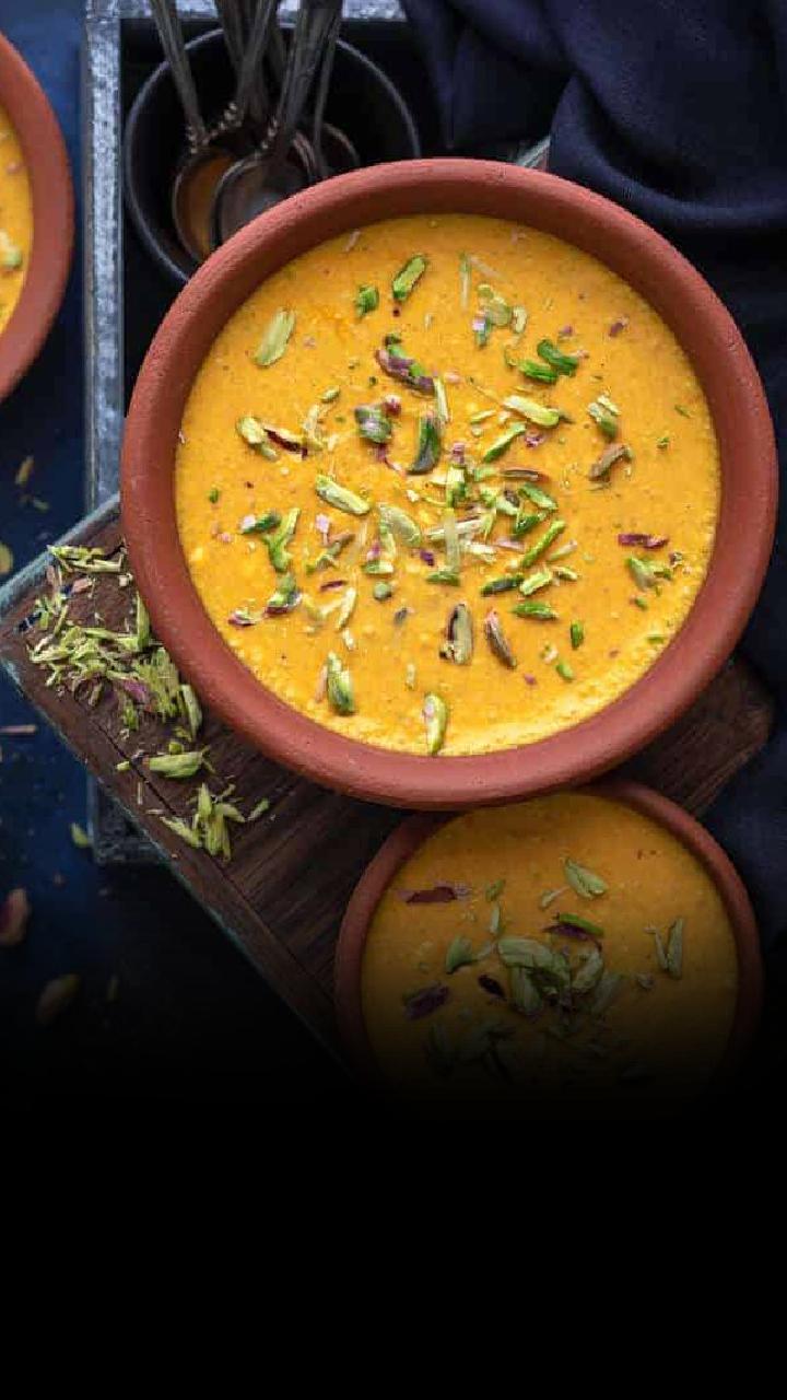 Milk, basmati rice, sugar, mango puree, cardamom, and nuts for garnish, saffron, almond powder, rose patels.