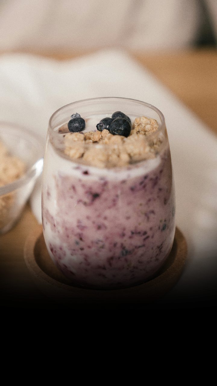 1 cup fresh or frozen blueberries, 1/2 cup yogurt, 1 tbsp honey, 1 tsp lemon juice, ice cubes (optional).
