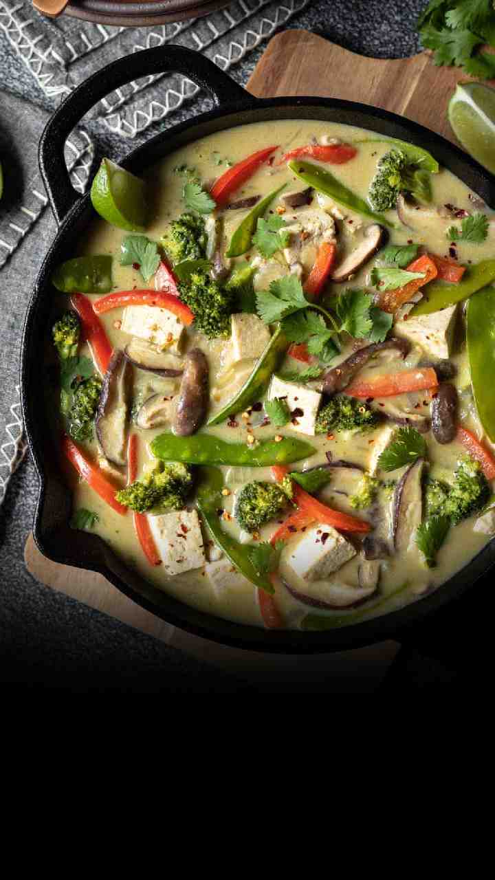 Broccoli, tofu, coconut milk, green curry, soy sauce, sugar, basil, onion, ginger, garlic, red bell pepper, Coriander.