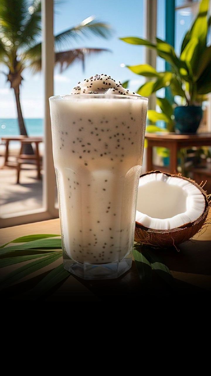 In a blender, add grated coconut, coconut milk, soaked chia seeds, banana and pineapple chunks, and a pinch of sugar to sweeten.