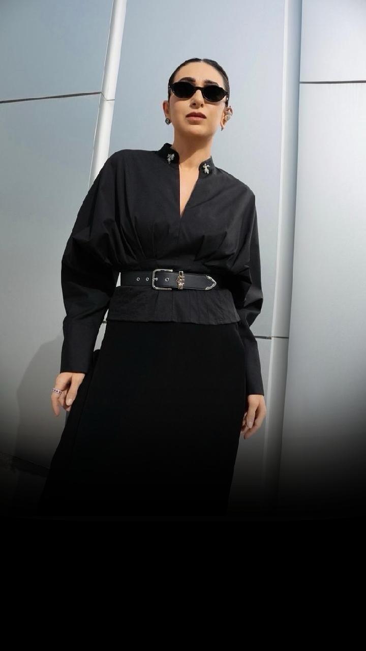 Karisma Kapoor steps out in a striking pure-black shirt–skirt combo, cinched with a matching belt.