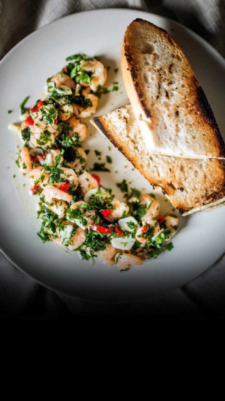300g prawns (peeled & deveined), 4 minced garlic cloves, 3 tbsp butter, 1 tbsp olive oil, juice of ½ lemon, salt & pepper to taste, chopped parsley for garnish.