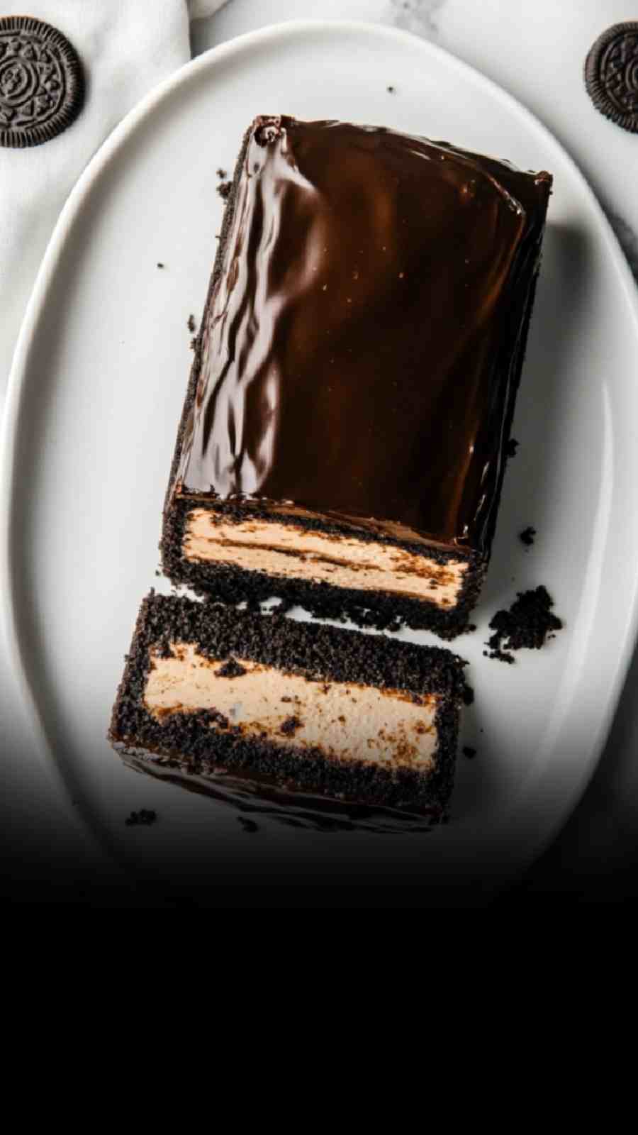 Crush Oreos into crumbs, mix with espresso powder and melted butter, and press into the pan to form the crust.