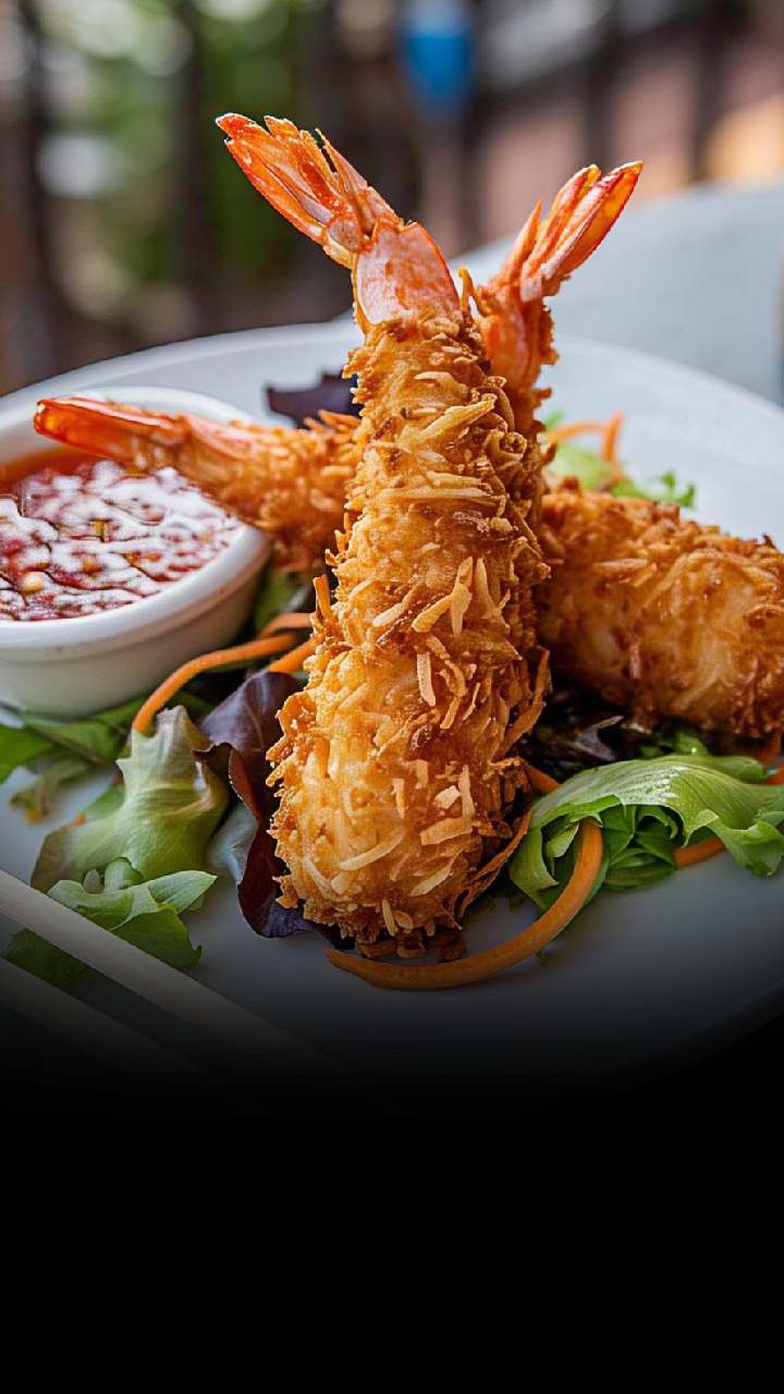 Add ingredients: 1 lb large shrimp, 1 cup shredded coconut, 1/2 cup breadcrumbs, 2 eggs, Salt and pepper to taste, 1/2 cup flour.
