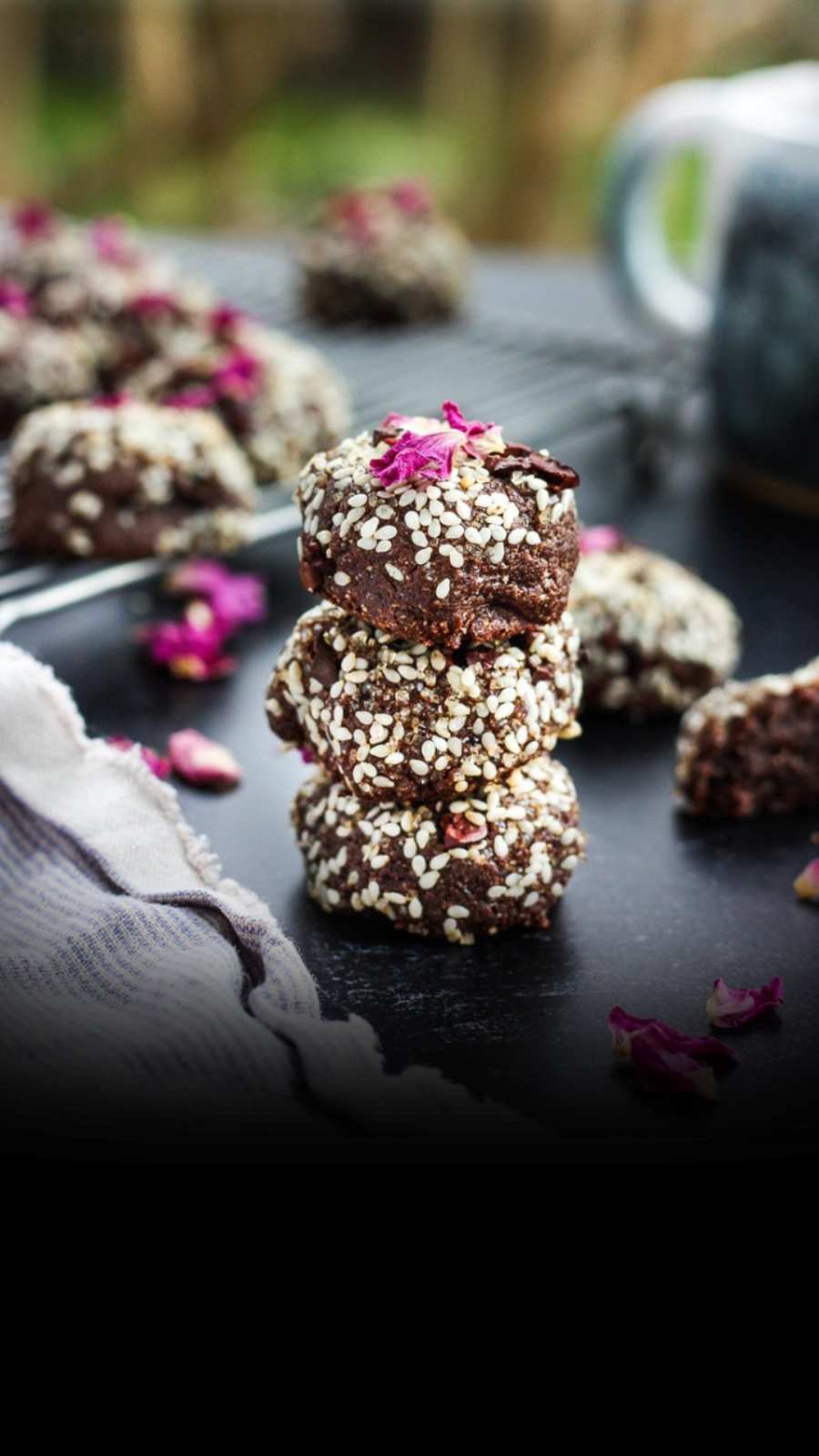 Use a cookie scoop or roll in small balls. Dip in sesame seeds and cocoa nibs.