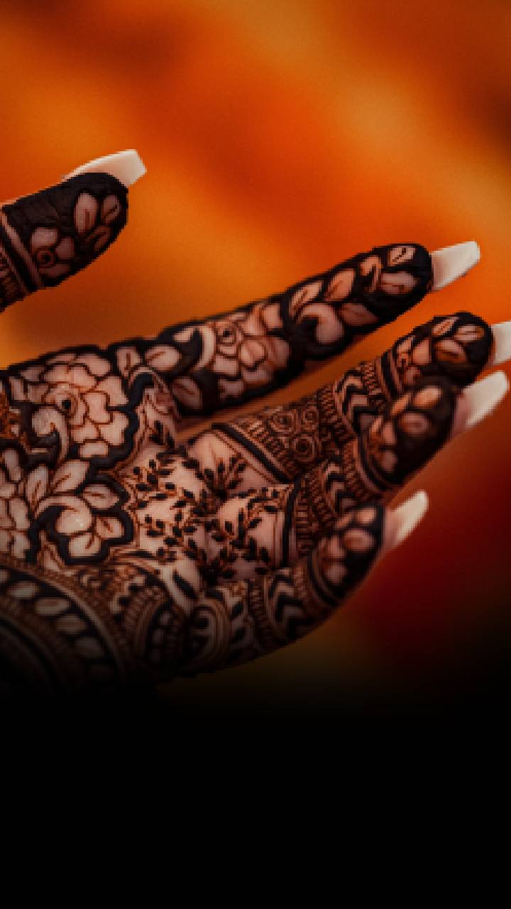 Intricate Mehendi designs for hands, including finger and palm designs.