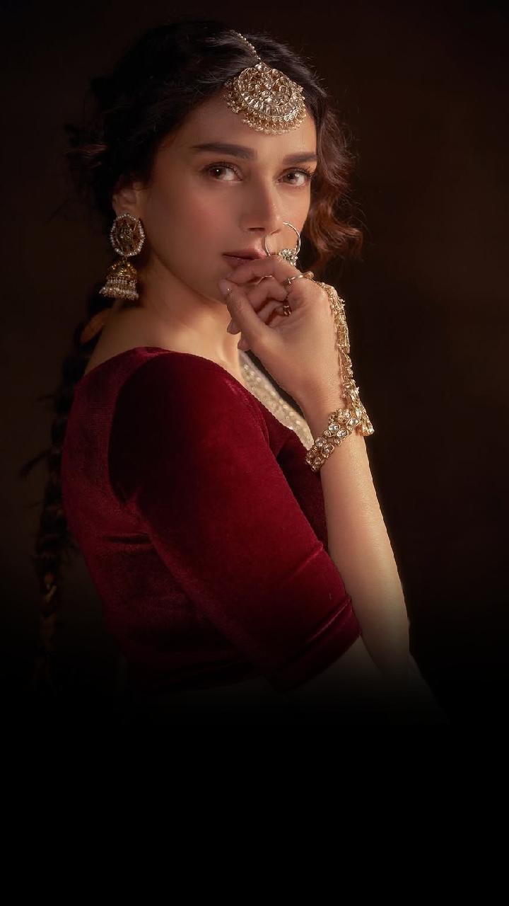 Aditi Rao Hydari looks regal in a dark teal ethnic outfit with a heavily embellished neckline.