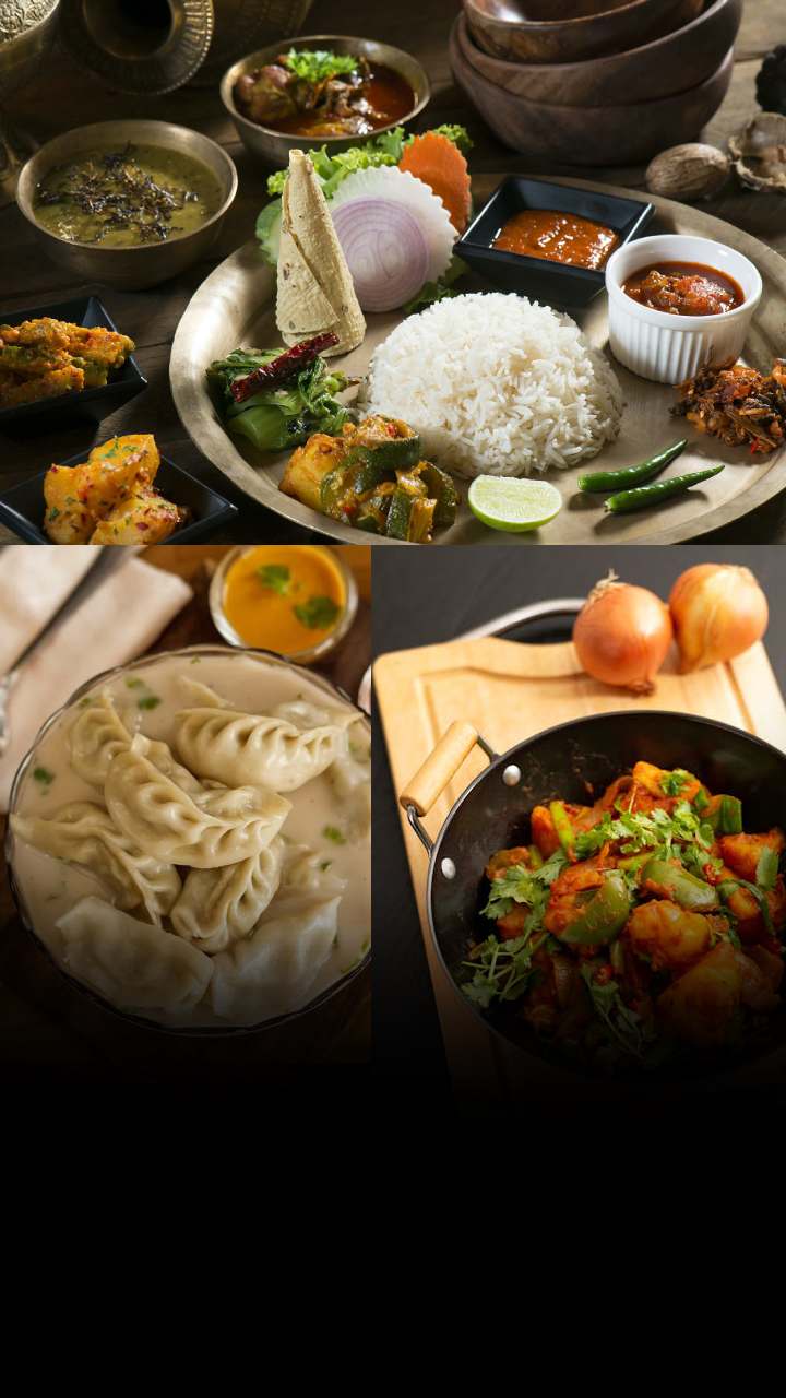 The staple Nepali meal of rice (bhat) served with lentil soup (dal), vegetables, and pickles.