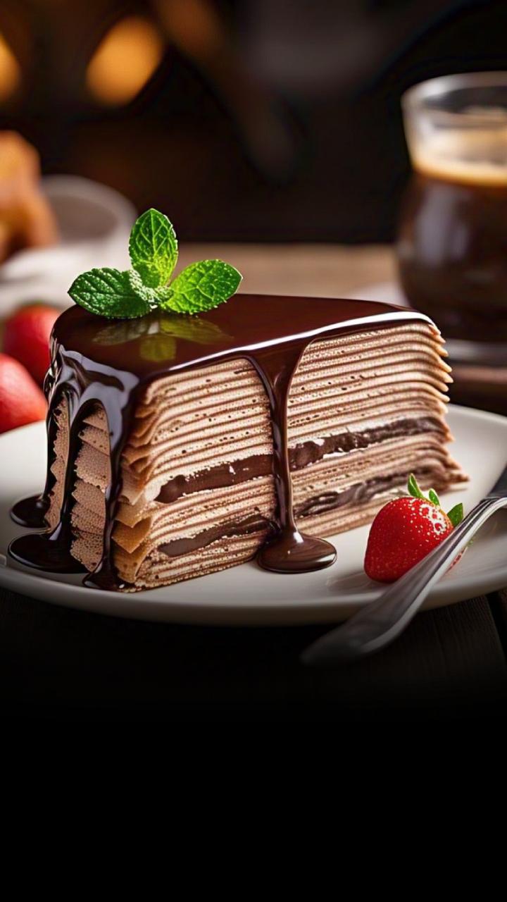 Refrigerate for 2 hours to set. Slice and enjoy your decadent chocolate crepe cake!