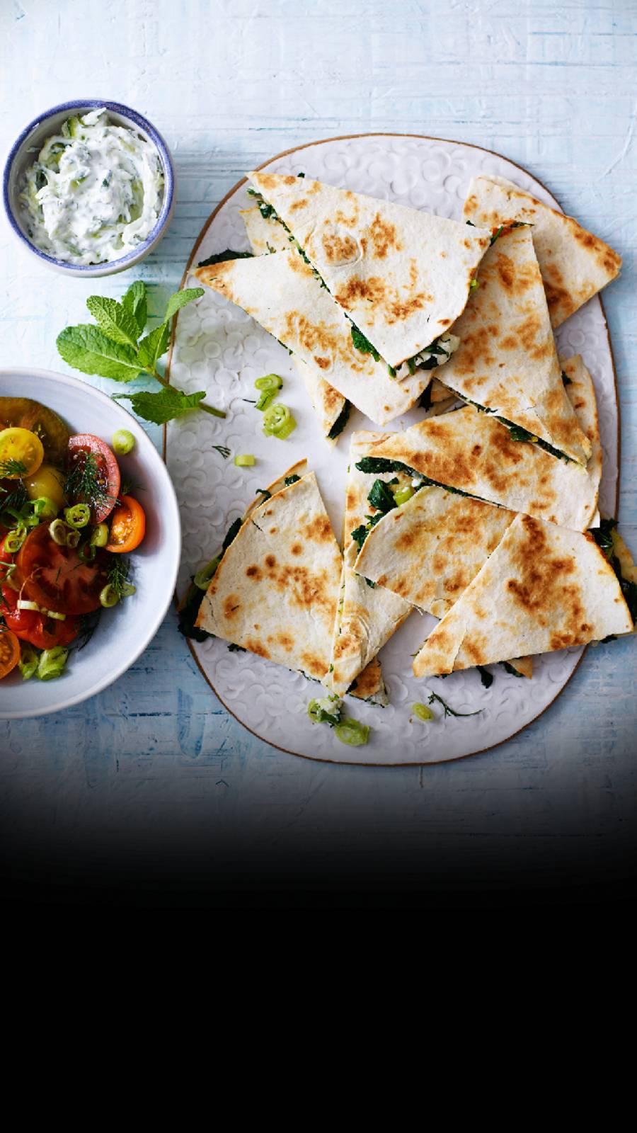 Once crispy and golden, slice your quesadilla into wedges and serve with a side of tzatziki sauce.