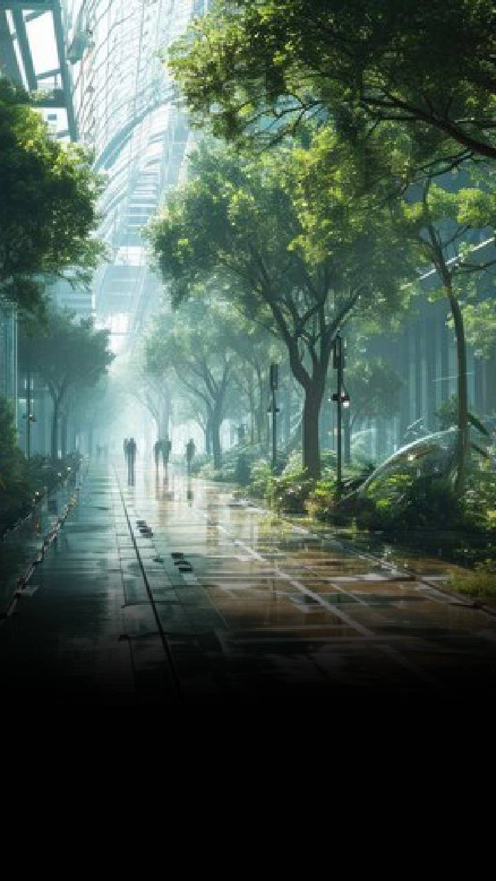 Cities powered by renewable energy, featuring vertical gardens, green rooftops, and AI-managed waste systems.