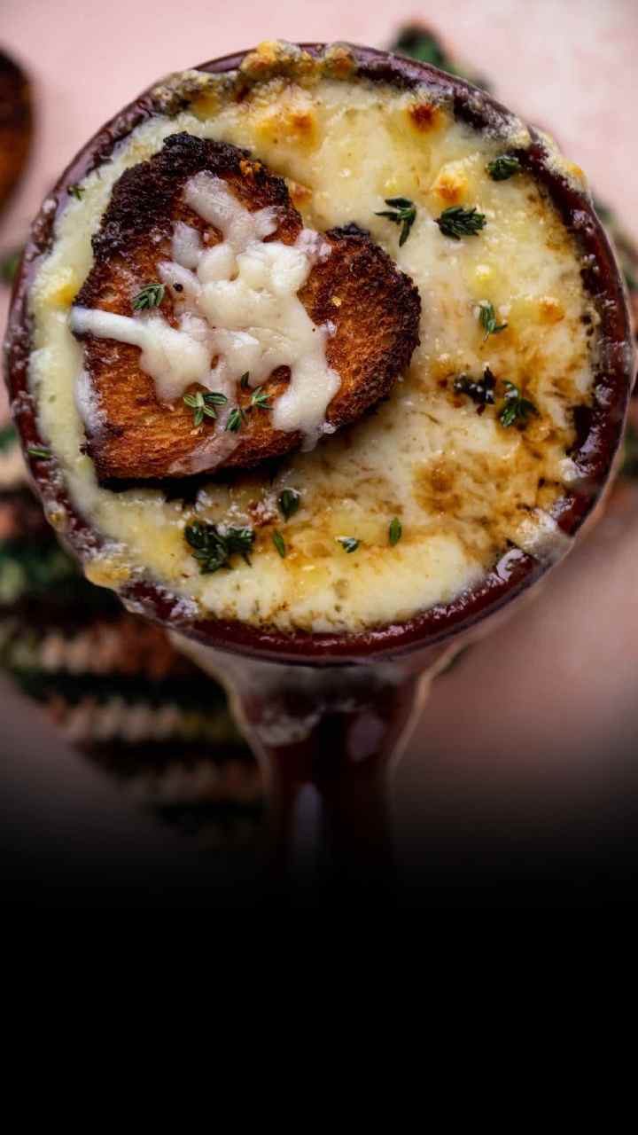 Onions, garlic, broth, butter, olive oil, thyme, bay leaves, baguette, Gruyère, salt, pepper.