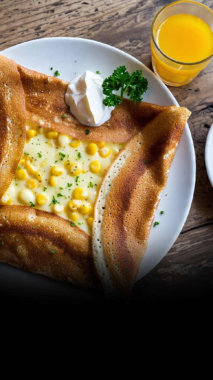 Spoon the cheese and corn mixture into the center of the cooked crepe, then fold it into quarters or roll it up.