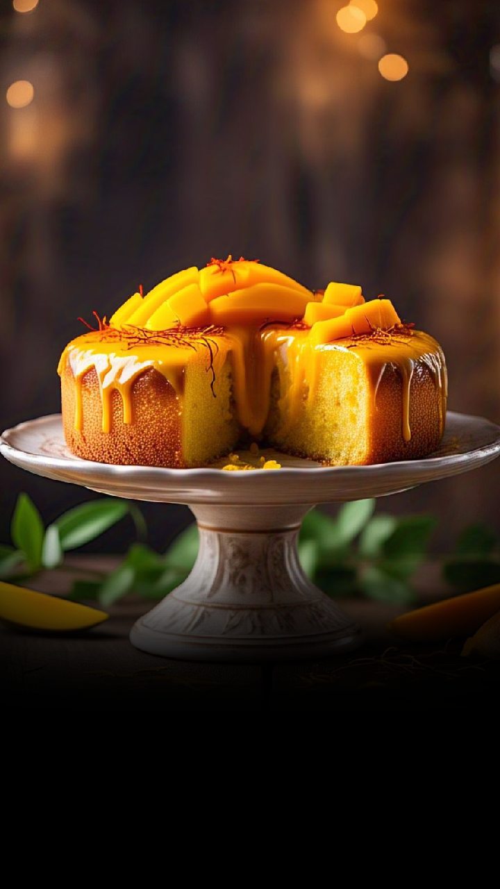Let the cake cool before serving. Enjoy your tropical Mango Saffron Cake!