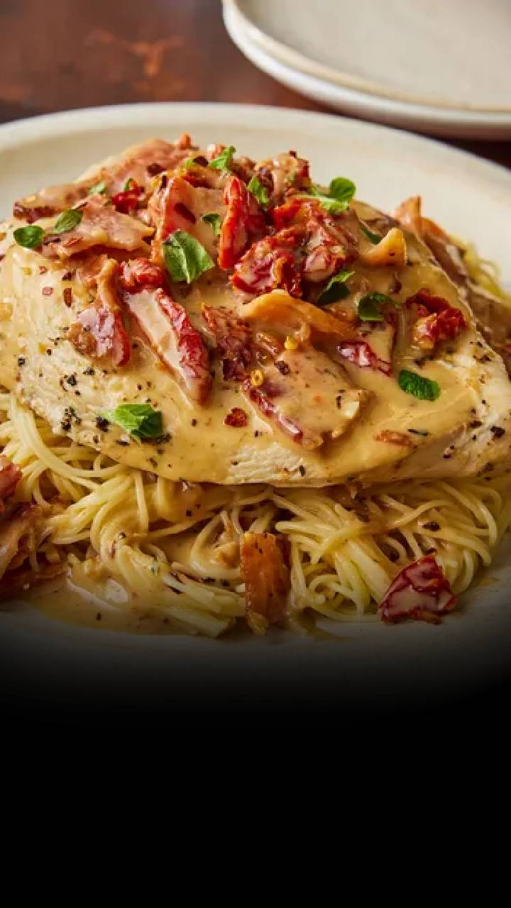 Make the sauce by whisking flour, chicken broth, Parmesan, and cream, add sun-dried tomatoes, bacon, and chicken.