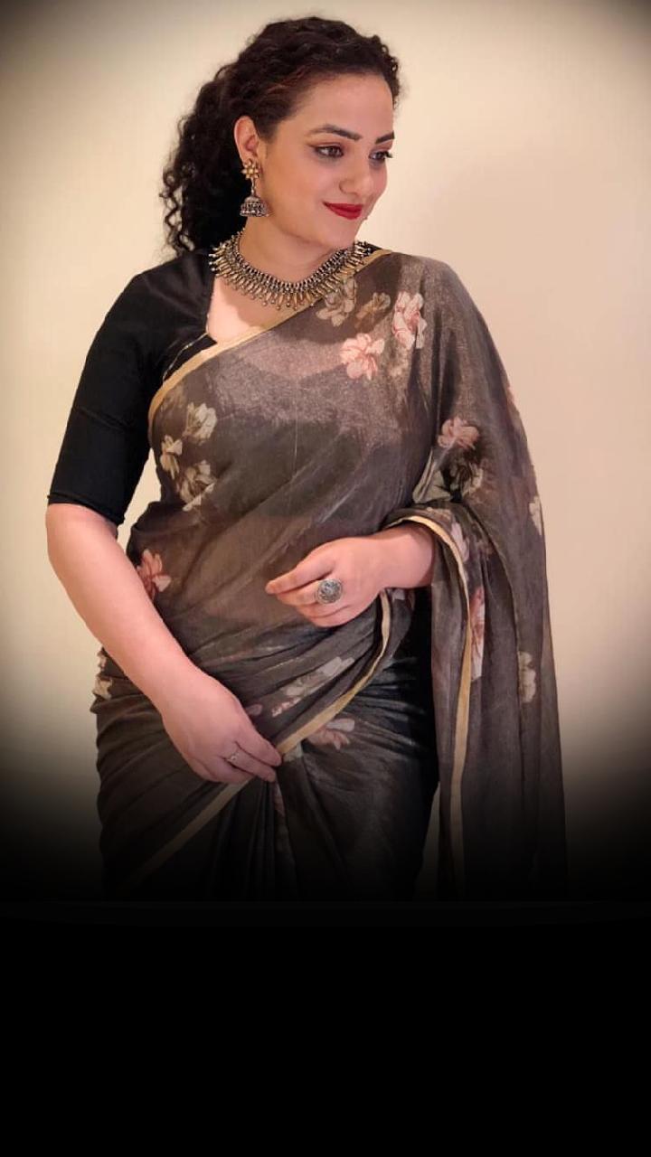 Nithya stuns in a delicate pink saree with soft pleats and vintage romance.
