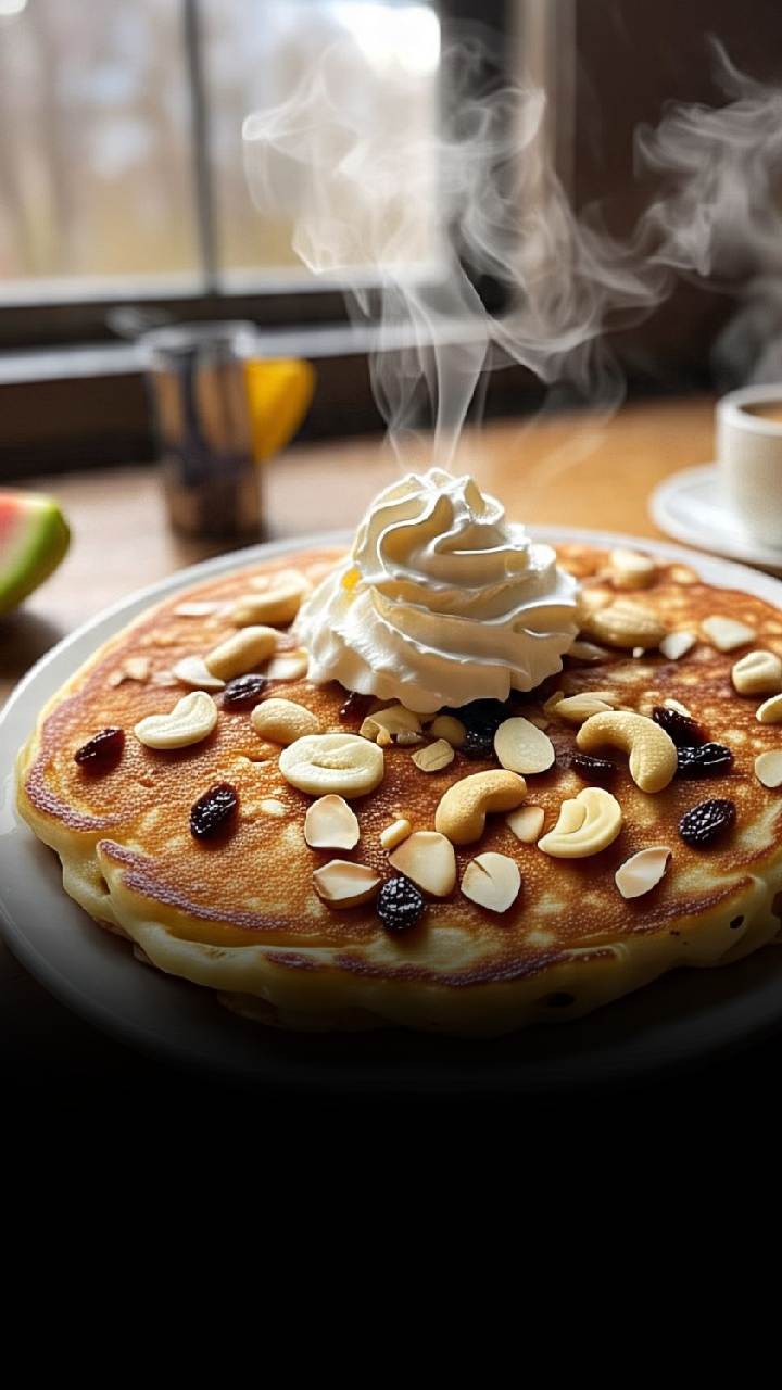 Layer the pancakes, add a drizzle of honey or syrup, and sprinkle extra dry fruits for added texture and flavour.