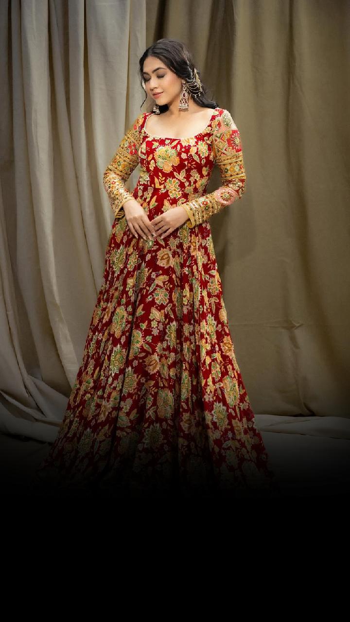 The intricate floral threadwork on her flare makes this outfit a masterpiece.
