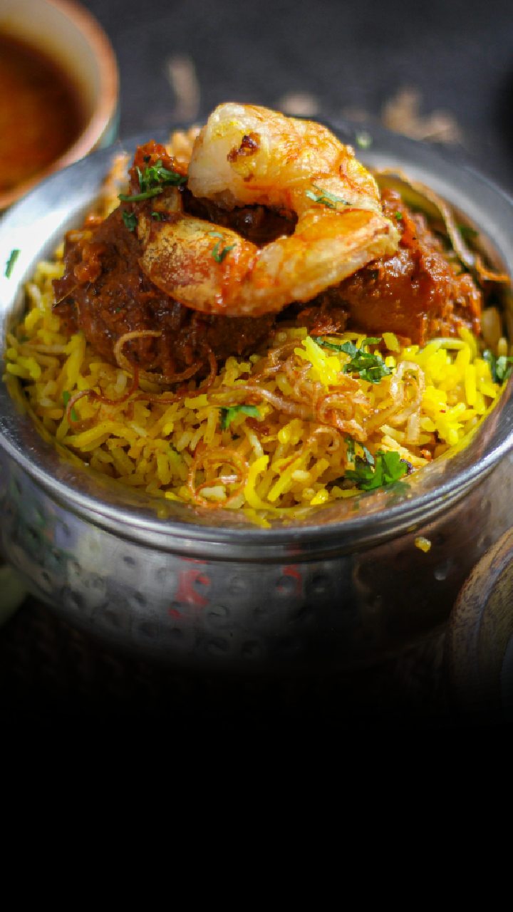 Layer rice over prawn masala. Top with saffron milk, mint, coriander, fried onions. Dum cook for 15–20 mins.