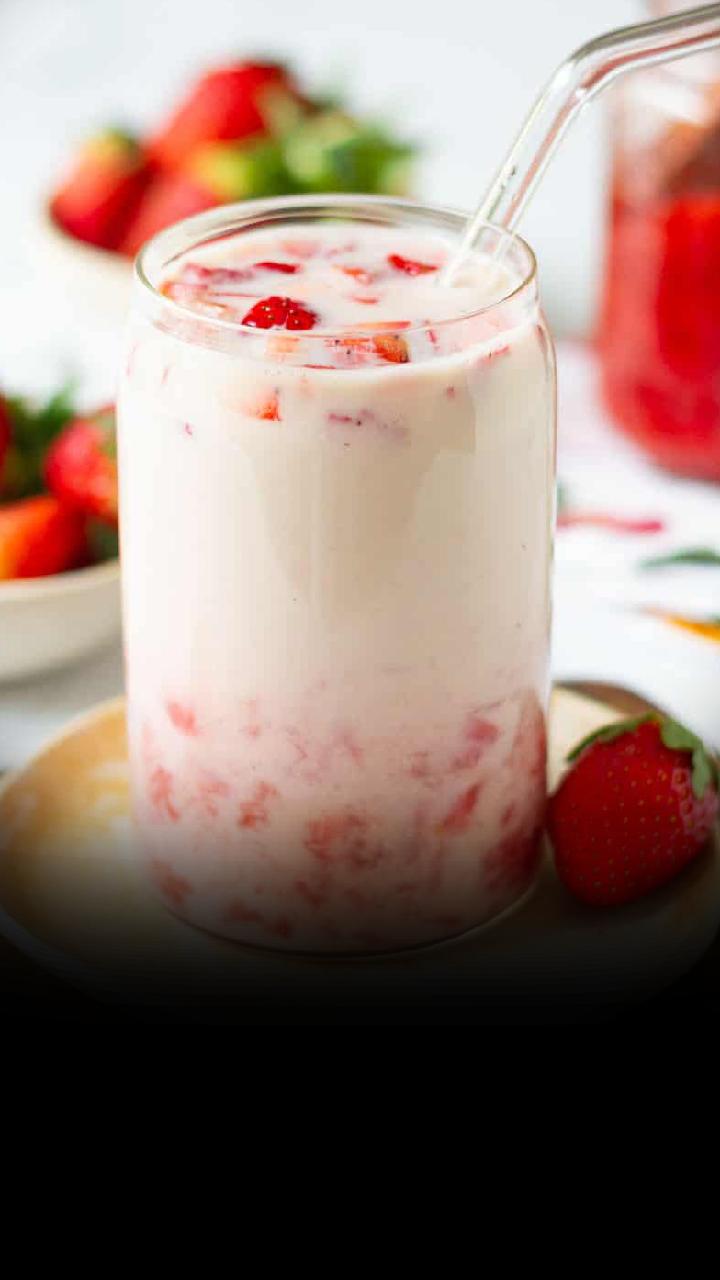 1 cup fresh strawberries, 2 tbsp sugar, 1 cup cold milk .