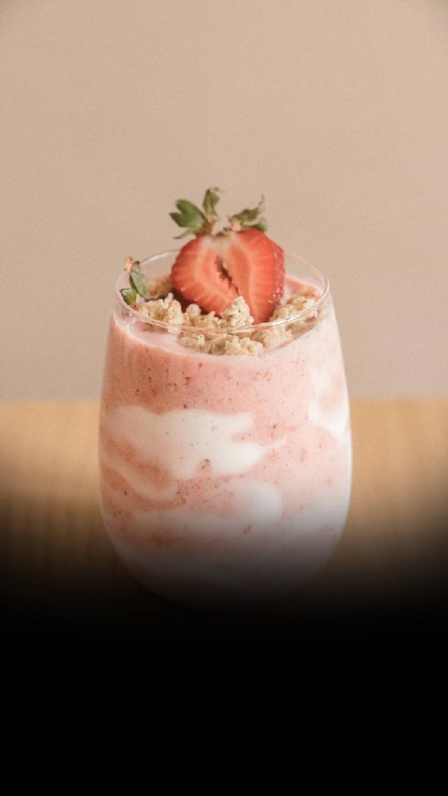 Indulge in the Sweetness of strawberry cheesecake smoothie with whipped cream garnished on top.