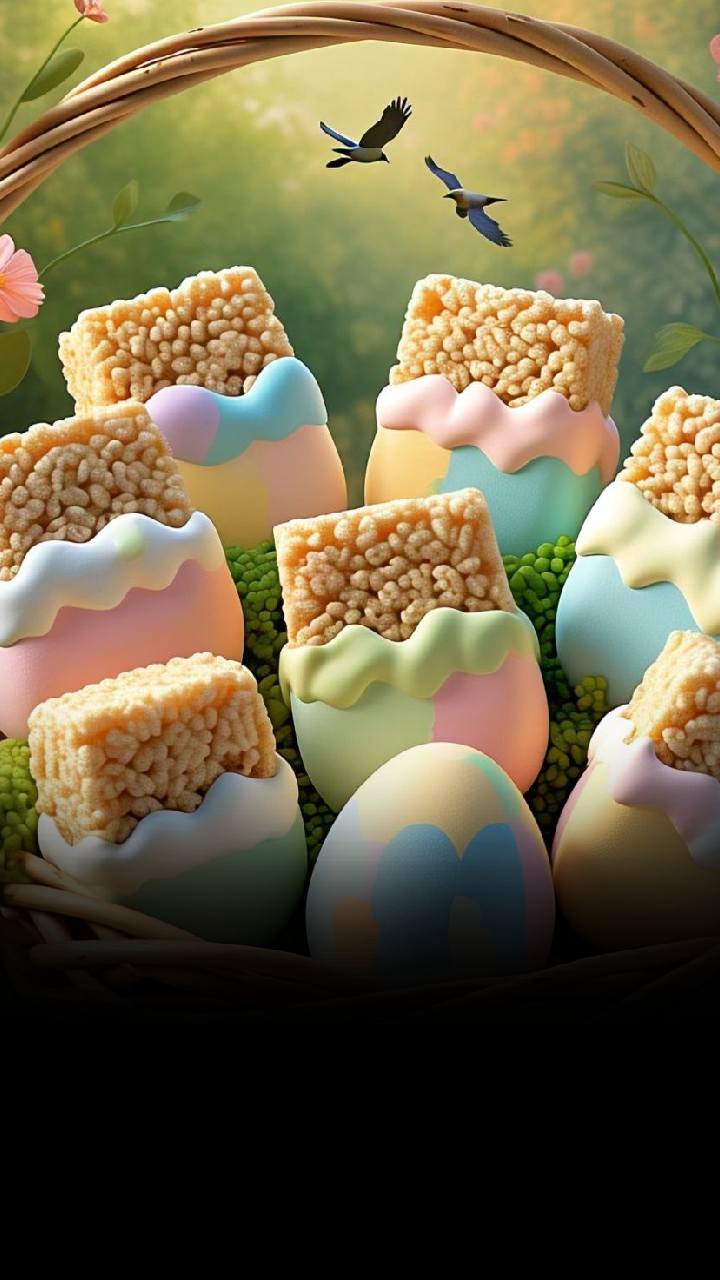 Mold Rice Krispie treats into egg shapes and drizzle with coloured white chocolate- colourful, fun and kid-friendly treat.