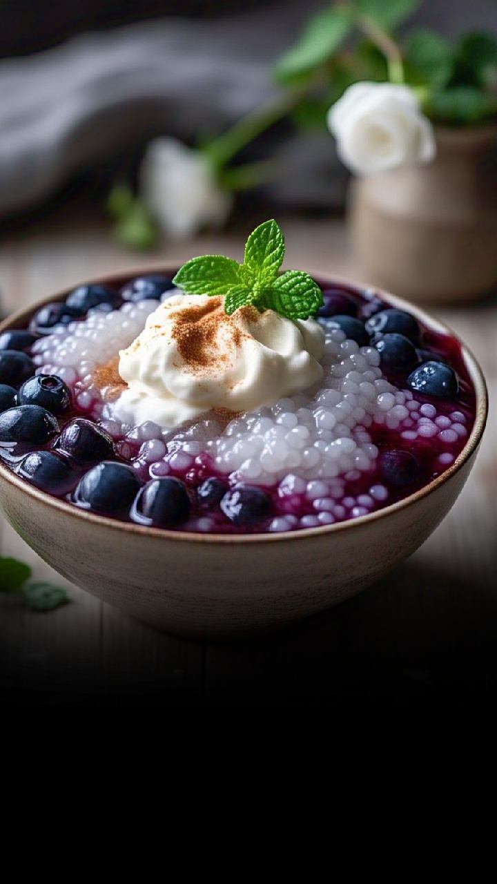 ½ cup sago pearls, 1 ½ cups coconut milk, 1 cup fresh blueberries, 2 tbsp sugar, 1 tsp vanilla extract.