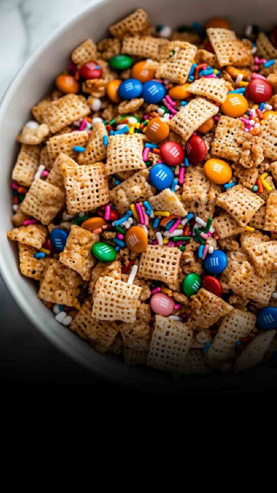 Chex cereal, white chocolate, pink melts, M&Ms, sprinkles, sugar.