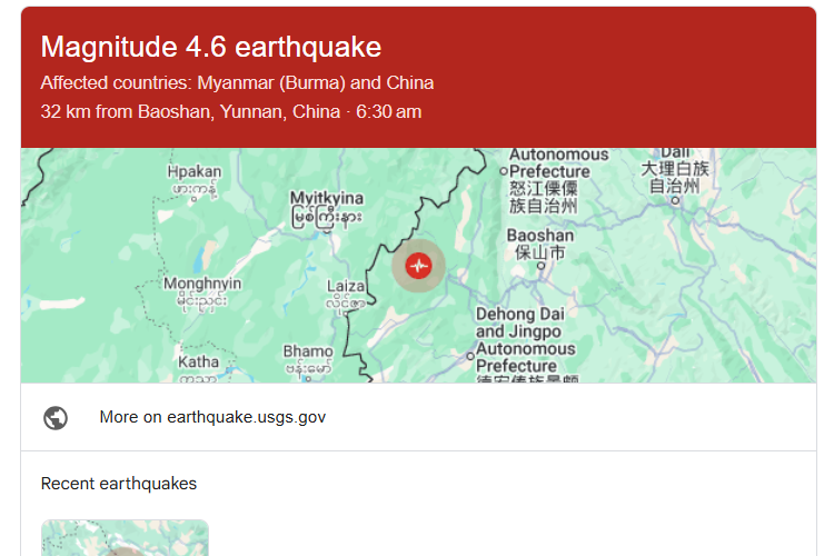 A magnitude 4.6 earthquake struck south western China on Friday, May 16 with tremors felt in neighbouring Myanmar. According to U.S. Geological Survey, the quake occurred at around 6:30 am with the epicenter 32 km from Baoshan, Yunnan. The affected countries were Myanmar and China. There have been no immediate reports of major damage or casualties, authorities are monitoring the situation. National Center for Seismology (NCS), the nodal agency of the Government of India for monitoring of earthquake activity in the country, also reported the earthquake.
