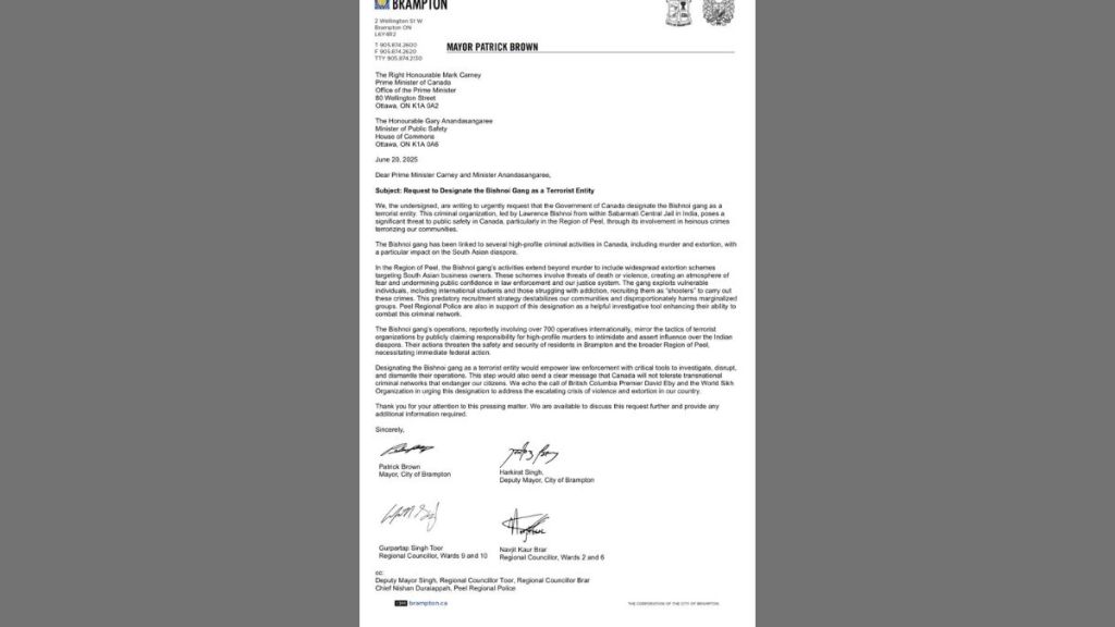The letter states the subject as “Request to Designate the Bishnoi Gang as a Terrorist Entity.” It states that the criminal organisation, led by Lawrence Bishnoi from within Sabarmati Central Jail in India, poses a significant threat to public safety in Canada. Region of Peel has been especially named in the letter. The letter further exposes Bishnoi gang’s involvement in high-profile criminal activities in Canada.